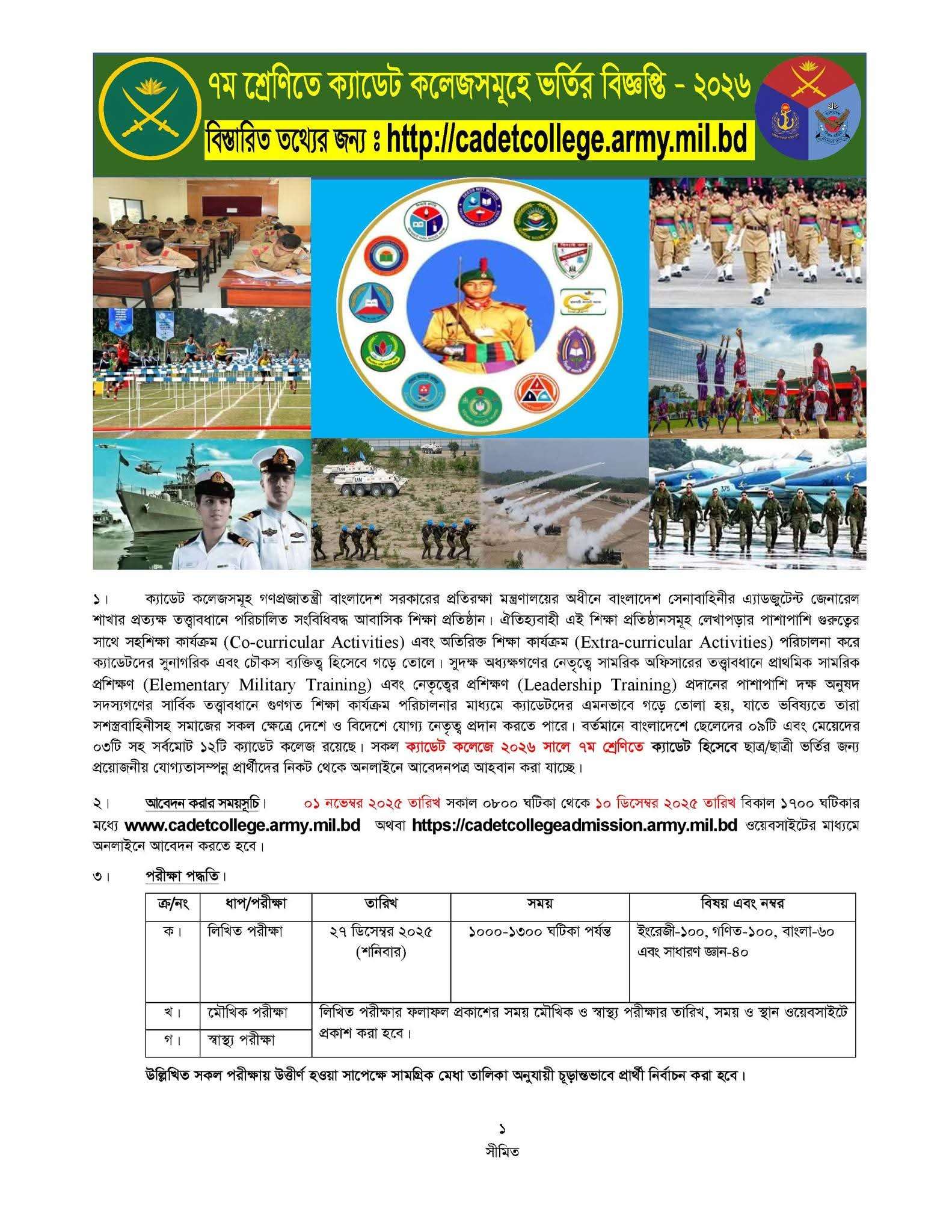 নতুন নিয়মে Cadet College Admission Circular 2026 ক্যাডেট ভর্তি বিজ্ঞপ্তি